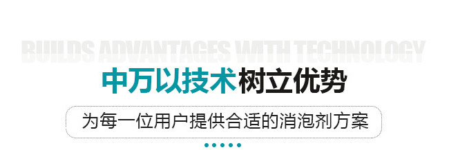 中萬是一家以解決各行業(yè)泡沫難題為使命的企業(yè),專注于各行業(yè)不同工藝的泡沫應(yīng)用研究,擁有8大體系成分產(chǎn)品,近2000個不同行業(yè)、不同細分領(lǐng)域工藝的成功應(yīng)用經(jīng)驗與解決方案,為您的生產(chǎn)工藝保駕護航。中萬在化工泡沫領(lǐng)域扮演著重要的角色,從嚴謹?shù)倪x料到獨特的應(yīng)用方案,推動著整個消泡劑行業(yè)的優(yōu)化升級,中萬因領(lǐng)先而備受推崇,用技術(shù)成就高效,提方案帶來卓越,讓服務(wù)適應(yīng)市場,中萬在消泡劑精益求精的道路上不斷地為客戶謀發(fā)展而開拓創(chuàng)造。